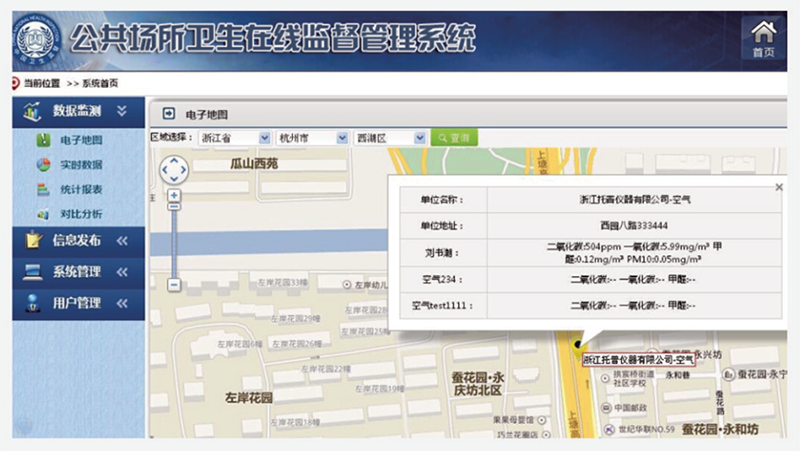 分為電子地圖、實(shí)時(shí)數(shù)據(jù)、統(tǒng)計(jì)報(bào)表、對比分析四個(gè)模塊,可實(shí)現(xiàn)對公共場所的環(huán)境數(shù)據(jù)包括:空氣、微小氣候(濕度、溫度、風(fēng)速)、水質(zhì)、采光、照明、噪聲等信息的精準(zhǔn)采集、分析、顯示,便于用戶查詢數(shù)據(jù)并提供直觀準(zhǔn)確的數(shù)據(jù)分析報(bào)表,方便主管部門實(shí)時(shí)監(jiān)管,維護(hù)群眾安全。