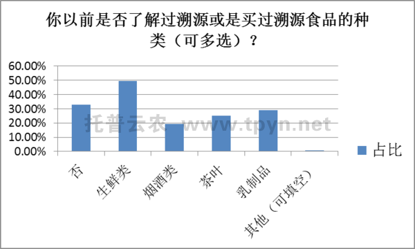 目前,市場(chǎng)上出現(xiàn)了較多種類的溯源食品,例如生鮮類、乳制品類、茶葉類、煙酒類等。在此次調(diào)查中,有約68%的人表示了解或購(gòu)買過(guò)溯源食品。近50%的人購(gòu)買過(guò)生鮮類溯源食品,少數(shù)人購(gòu)買過(guò)乳制品、煙酒、茶葉等溯源食品。