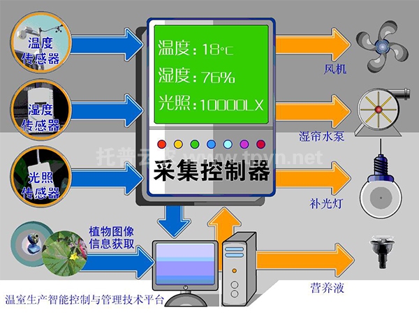 對于大規(guī)模的溫室化種植而言,單靠人工管理需要大量人手,耗力費時,并且存在難以避免的人工誤差。物聯(lián)網(wǎng)系統(tǒng)采集溫室內的空氣溫濕度、土壤水分、土壤溫度、二氧化碳、光照強度等實時環(huán)境數(shù)據(jù),通過中繼節(jié)點傳輸?shù)娇刂浦行?,由中心平臺系統(tǒng)將最新監(jiān)測數(shù)據(jù)與預先設定適合農(nóng)作物生長的環(huán)境參數(shù)進行比較,比如發(fā)現(xiàn)傳感器檢測到的數(shù)據(jù)與預設數(shù)值有了偏差,計算機會自動發(fā)出指令,只能啟動系統(tǒng)相連接的通風機、遮陽、加濕、澆灌等設備的工作,直到大棚內環(huán)境數(shù)據(jù)達到系統(tǒng)預設的數(shù)據(jù)范圍之內,相關設備才會停止工作。