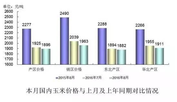 2016年8月份,我國玉米產(chǎn)區(qū)平均價格1896元/噸,比上月下降28元/噸,降幅1.48%;同比下降381元/噸,降幅16.73%。其中,東北產(chǎn)區(qū)價格為1882元/噸,環(huán)比下降12元/噸,降幅0.66%,同比下降407元/噸,降幅17.77%;華北黃淮產(chǎn)區(qū)價格為1911元/噸,環(huán)比下降44元/噸,降幅2.27%,同比下降355元/噸,降幅15.68%;國內(nèi)銷區(qū)玉米價格為1963元/噸,環(huán)比下降76元/噸,降幅3.75 %,同比下降527元/噸,降幅21.18%(圖)。