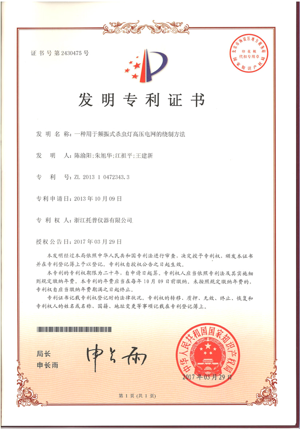 近日,我司托普云農(nóng)又喜獲一項(xiàng)發(fā)明專利。據(jù)悉,該發(fā)明專利名稱為“一種用于頻振式殺蟲燈高壓電網(wǎng)的繞制方法”,發(fā)明專號(hào)為ZL201310472343.3。
