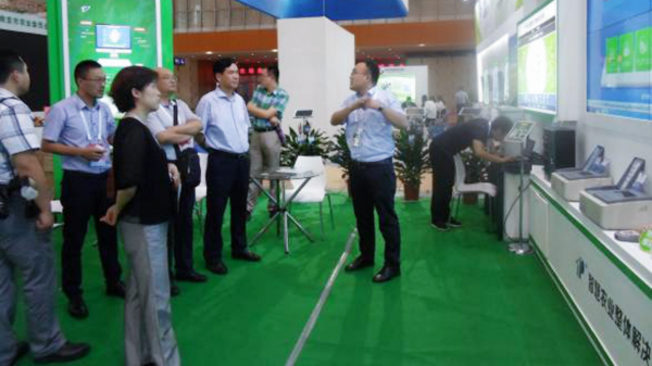 托普云農(nóng)現(xiàn)場工作人員向蒞臨展區(qū)的農(nóng)業(yè)部門領(lǐng)導介紹智慧農(nóng)業(yè)云平臺