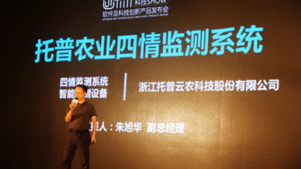 托普云農(nóng)副總經(jīng)理朱旭華在“創(chuàng)未來(lái)”軟件及科技創(chuàng)新產(chǎn)品發(fā)布會(huì)現(xiàn)場(chǎng)