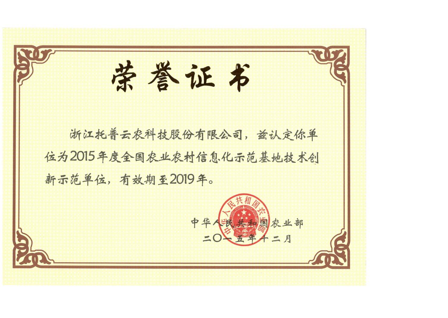 2015年12月9日,農業(yè)部發(fā)文公布《農業(yè)部關于認定2015年度全國農業(yè)農村信息化示范基地的通知》,浙江托普云農科技股份有限公司獲批技術創(chuàng)新型示范單位?!锻ㄖ芬蟾魇痉痘兀謩?chuàng)新、協(xié)調、綠色、開放、共享的發(fā)展理念,積極推進“互聯(lián)網+”現(xiàn)代農業(yè)行動,大力發(fā)展農業(yè),切實抓好農業(yè)電子商務、農業(yè)物聯(lián)網、農業(yè)農村大數(shù)據、農業(yè)信息服務等重點工作,大膽探索創(chuàng)新,充分發(fā)揮示范引領作用,為推進農業(yè)現(xiàn)代化作出新貢獻。
